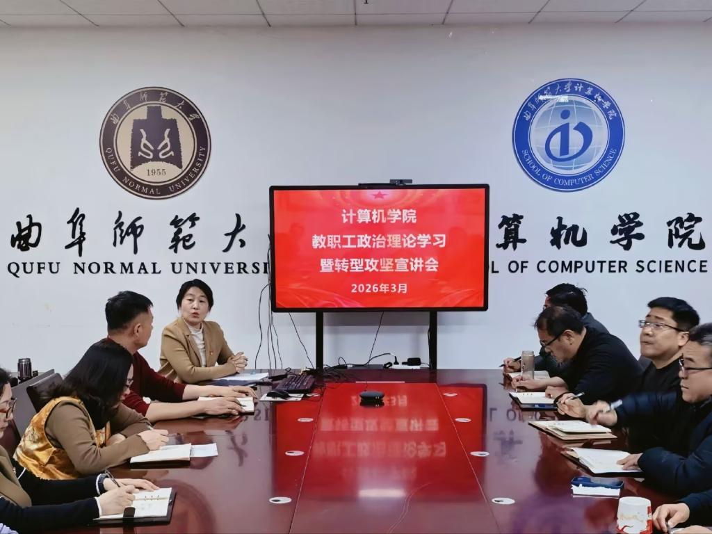 在C1011会议室举行教职工政治理论学习暨转型攻坚宣讲会,本次活动由党委书记张明洁主持,全体教职工参加。
