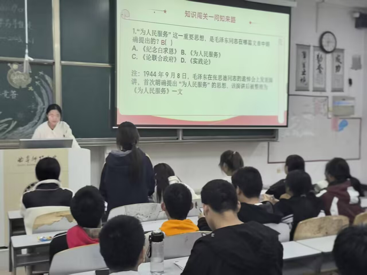 随后,一系列主题环节有序开展,以沉浸式体验带领团员重温红色历史、感悟精神伟力。在“看图识史”环节,长征、抗日战争、新中国建设等关键历史时期的珍贵影像依次呈现,团员们凭借扎实的党史知识储备,准确描述出了影像背后的历史事件、时代背景与精神内涵。“知识闯关”环节围绕党史、新中国史、改革开放史等内容设置竞答题,各小组团员积极抢答、激烈角逐,在比拼答题速度与知识准确率的过程中,进一步夯实红色理论基础,现场掌声与欢呼声此起彼伏。“在视频悟魂”环节,全体团员共同观看红色主题教育短片,直观感受革命先辈的崇高信仰与红色精神的时代传承。