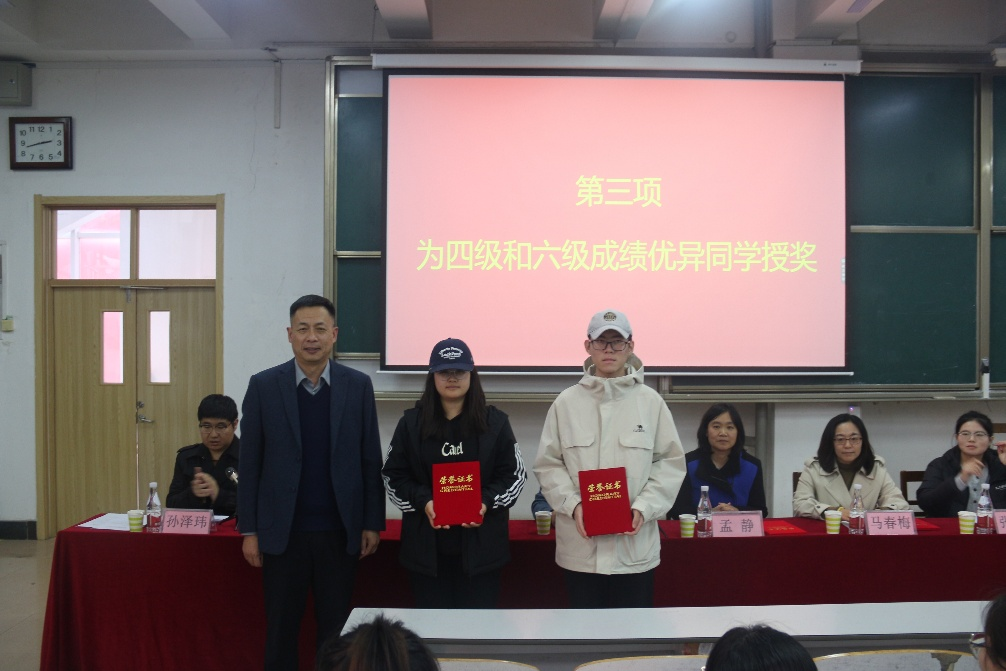 图5:孙旭春为四六级成绩优异同学发荣誉证书