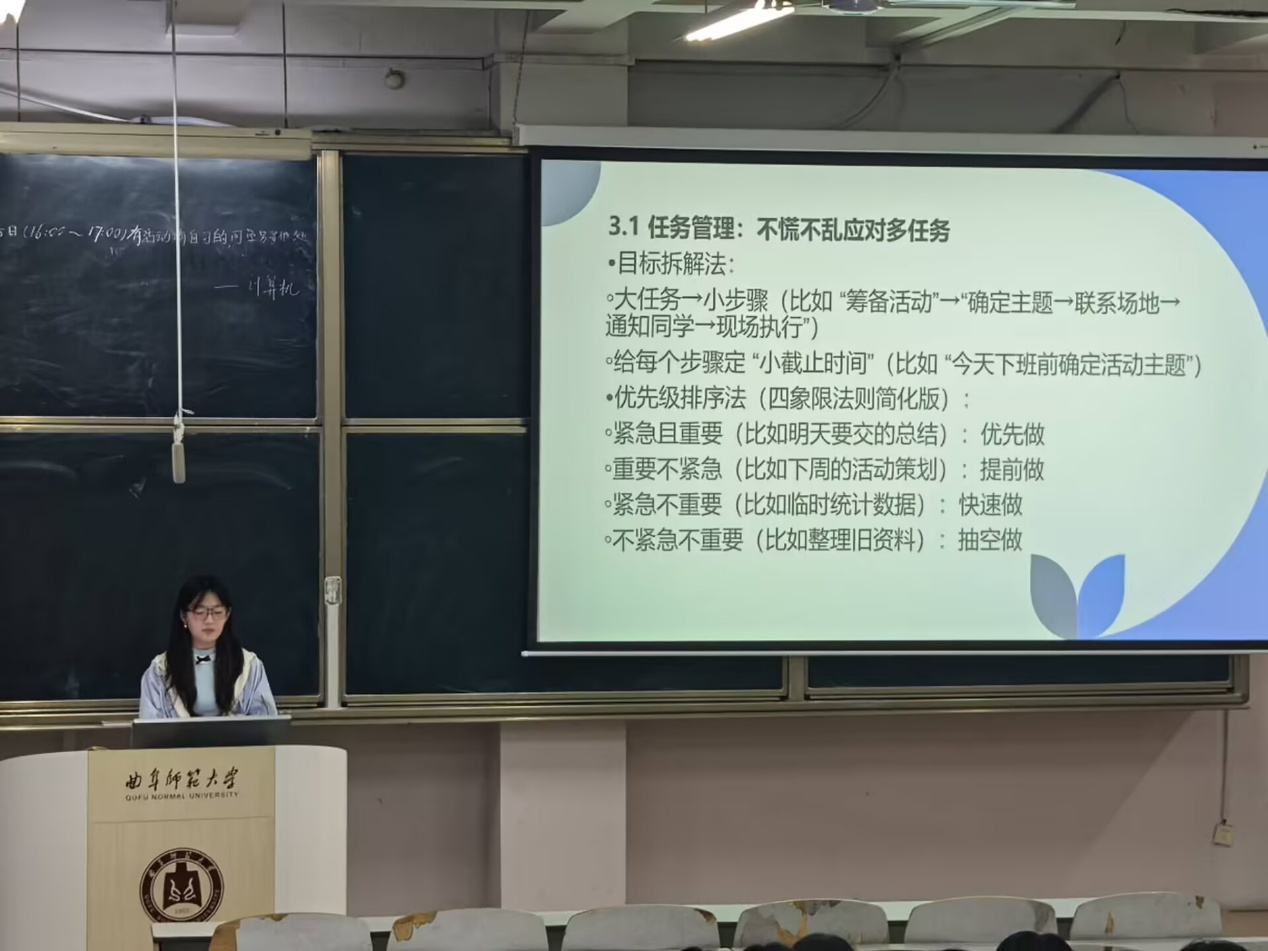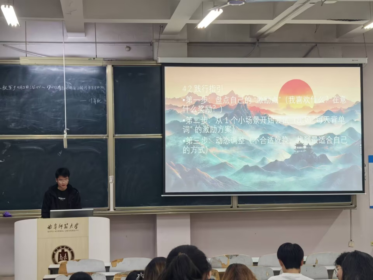 随后,志愿者工作部对激励机制进行培训。他科普了激励机制对自我提升的好处,强调自我激励不是“画大饼”,并教会学员们如何去践行,指引学员们一步步找到最适合自己的激励方式,让学员们能够从自我激励中有所进步、有所收获。